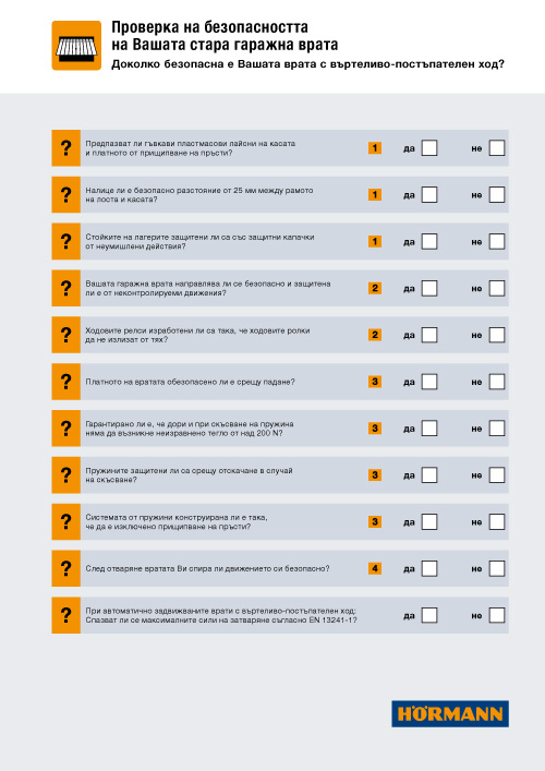 Гаражните секционните врати са тествани и сертифицирани съгласно високите изисквания за безопасност на европейската норма 13241-1. Дали старата Ви гаражна врата отговаря на актуалните норми за безопасност можете да установите с помощта на контролната карта за безопасност.